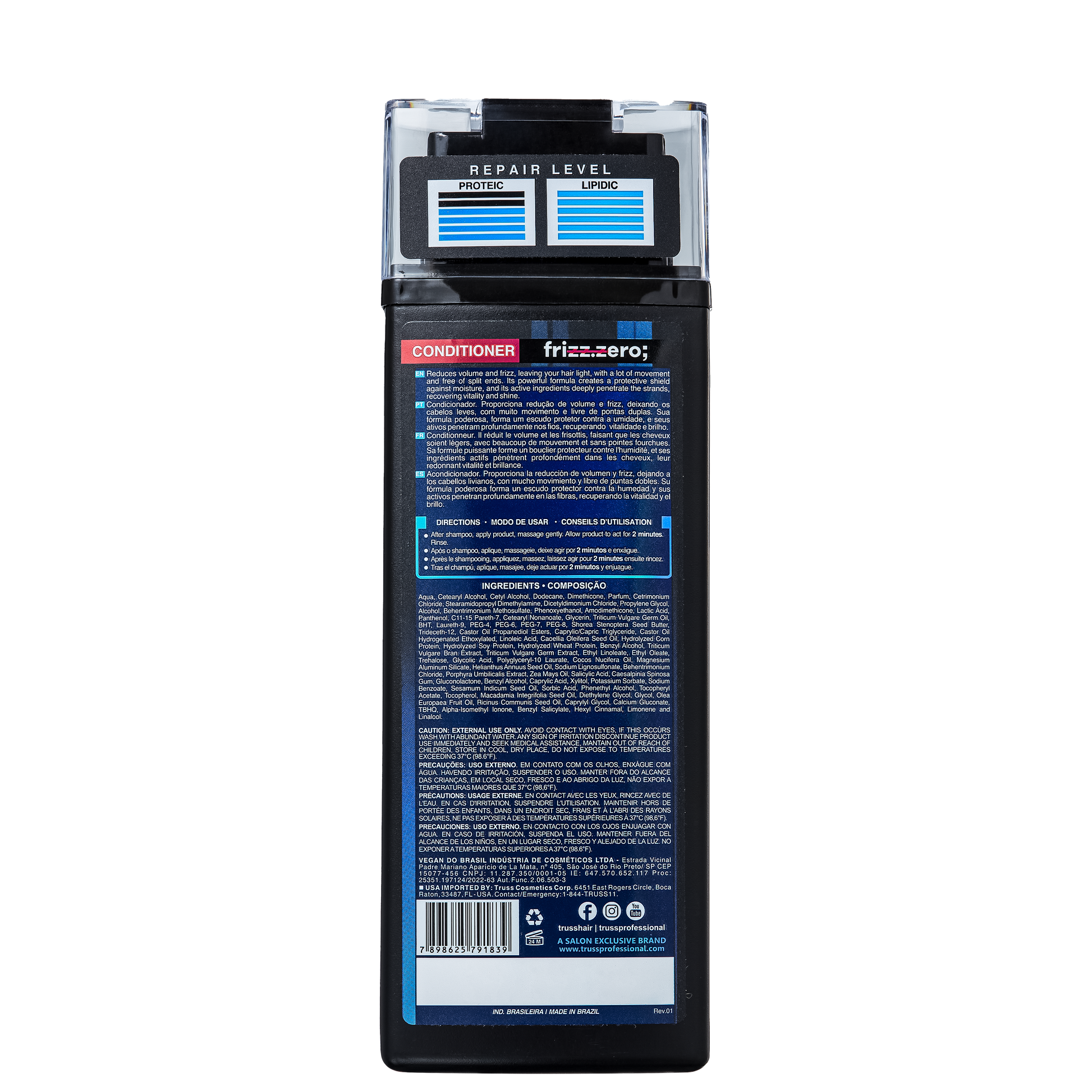 O Condicionador Truss Frizz Zero desembaraça, nutre e alinha os fios, proporcionando um cabelo mais suave, disciplinado e livre de frizz.
